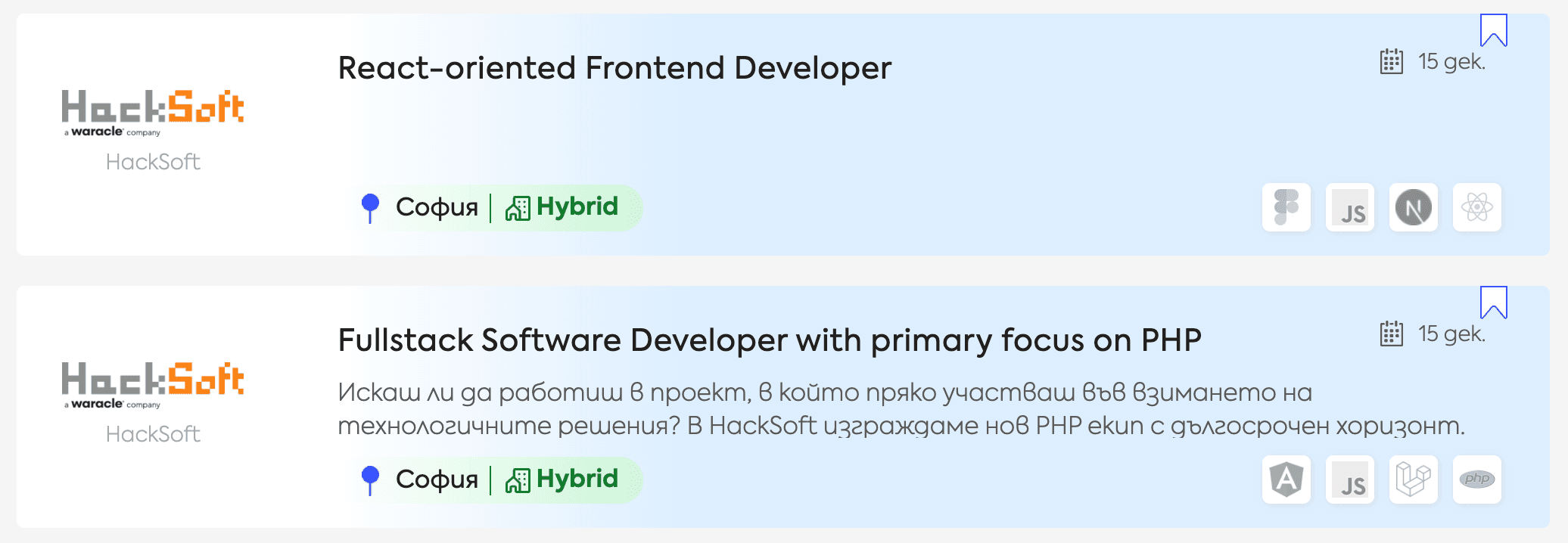 Всички позиции можеш да видиш на: https://dev.bg/company/hacksoft/